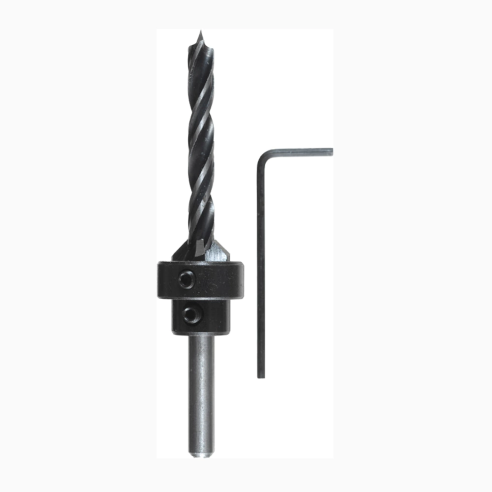Broca en espiral para madera con avellanador ajustable de 5 filos acero y tope de profundidad, vástago cilíndrico, para madera blanda y dura.