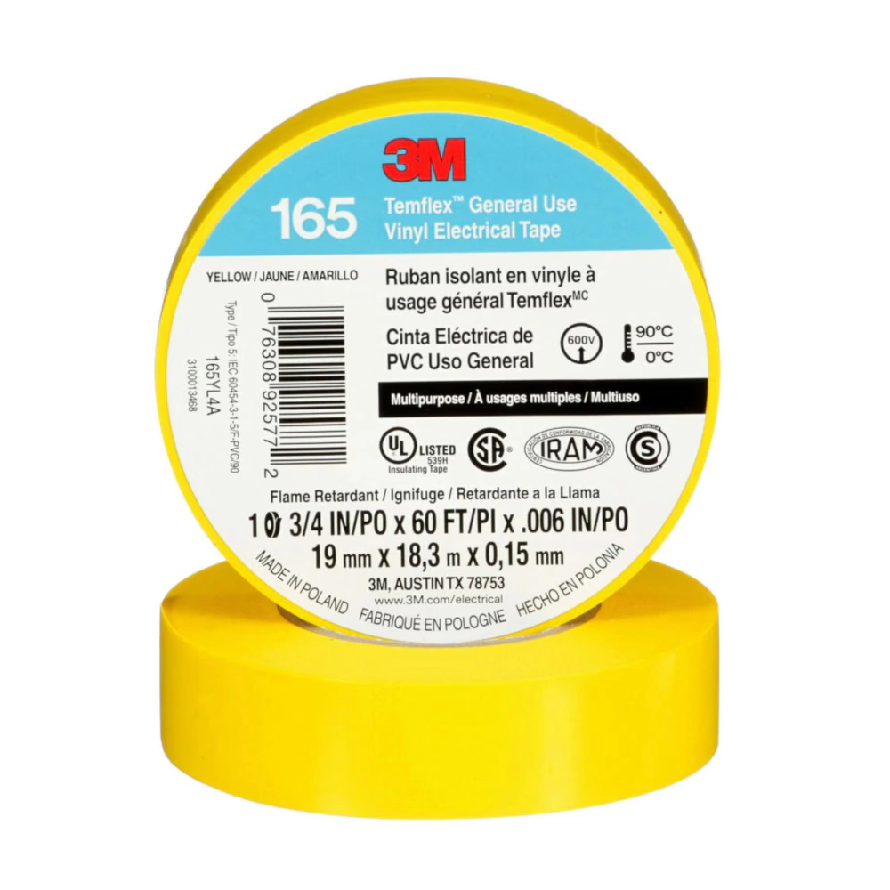 La Cinta Eléctrica de PVC 3M™ Temflex™ 165 de 0.152 mm (6 mils) de grosor es una cinta aislante de vinilo multipropósito y retardante a la llama disponible en distintos colores. Está diseñada para funcionar a temperaturas ambiente de hasta 194 °F (90 °C). La cinta se adapta para aplicaciones en climas fríos hasta 32 °F (0 °C).