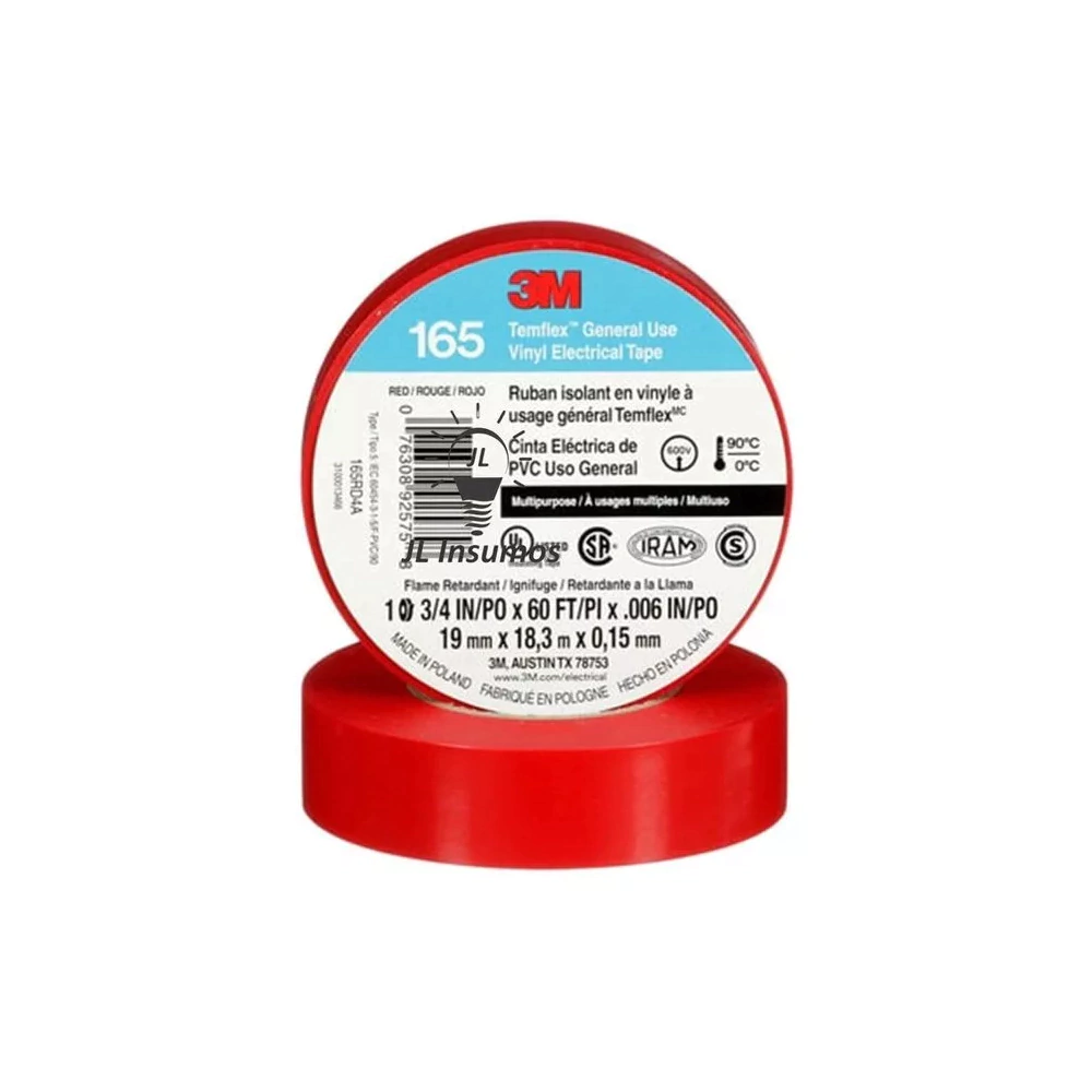 La Cinta Eléctrica de PVC 3M™ Temflex™ 165 de 0.152 mm (6 mils) de grosor es una cinta aislante de vinilo multipropósito y retardante a la llama disponible en distintos colores. Está diseñada para funcionar a temperaturas ambiente de hasta 194 °F (90 °C). La cinta se adapta para aplicaciones en climas fríos hasta 32 °F (0 °C).