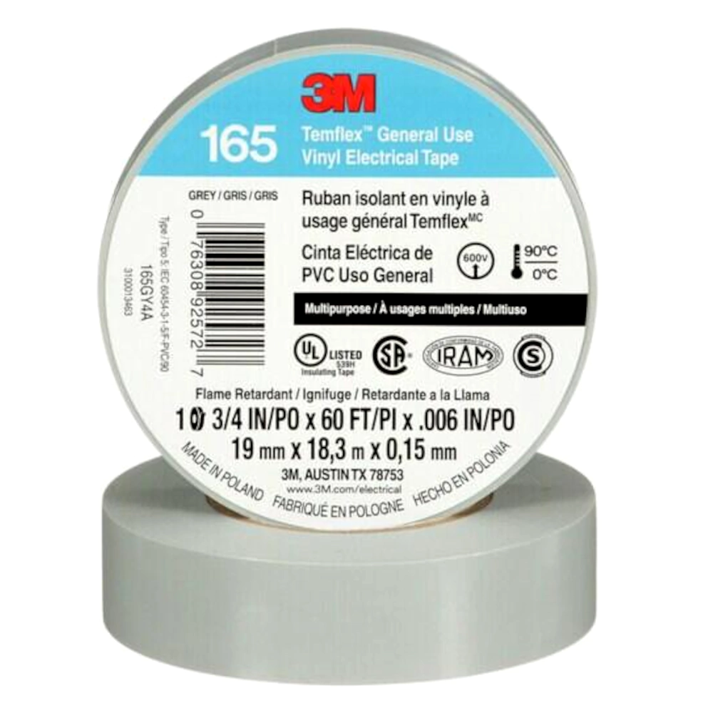 La Cinta Eléctrica de PVC 3M™ Temflex™ 165 de 0.152 mm (6 mils) de grosor es una cinta aislante de vinilo multipropósito y retardante a la llama disponible en distintos colores. Está diseñada para funcionar a temperaturas ambiente de hasta 194 °F (90 °C). La cinta se adapta para aplicaciones en climas fríos hasta 32 °F (0 °C).