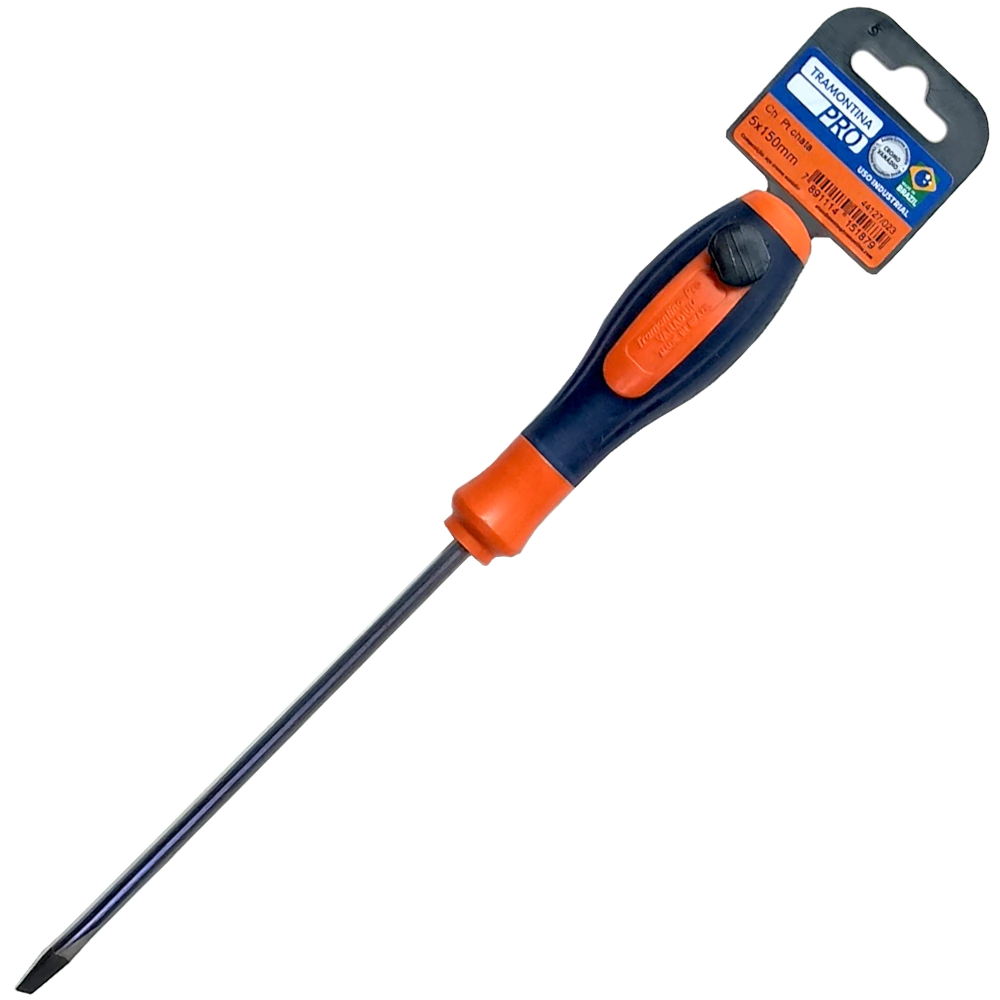 Asta en acero cromo vanadio templada. Acabado cromado. Punta magnetizada y fosfatada. Mango con dupla inyección en PP y goma. DIN ISO 2380. Punta chata. Las astas de los destornilladores son testadas en máquina de ensayo específica, para verificar el perfecto balance entre resistencia mecánica y dureza. Los dimensionales de las puntas son verificados con gabaritos padronizados, calibrados y certificados y la calidad del fosfato es inspeccionada en el microscópio. Ajustar o aflojar tornillos de hendidura simples. Las herramientas son producidas y testadas bajo normas específicas.