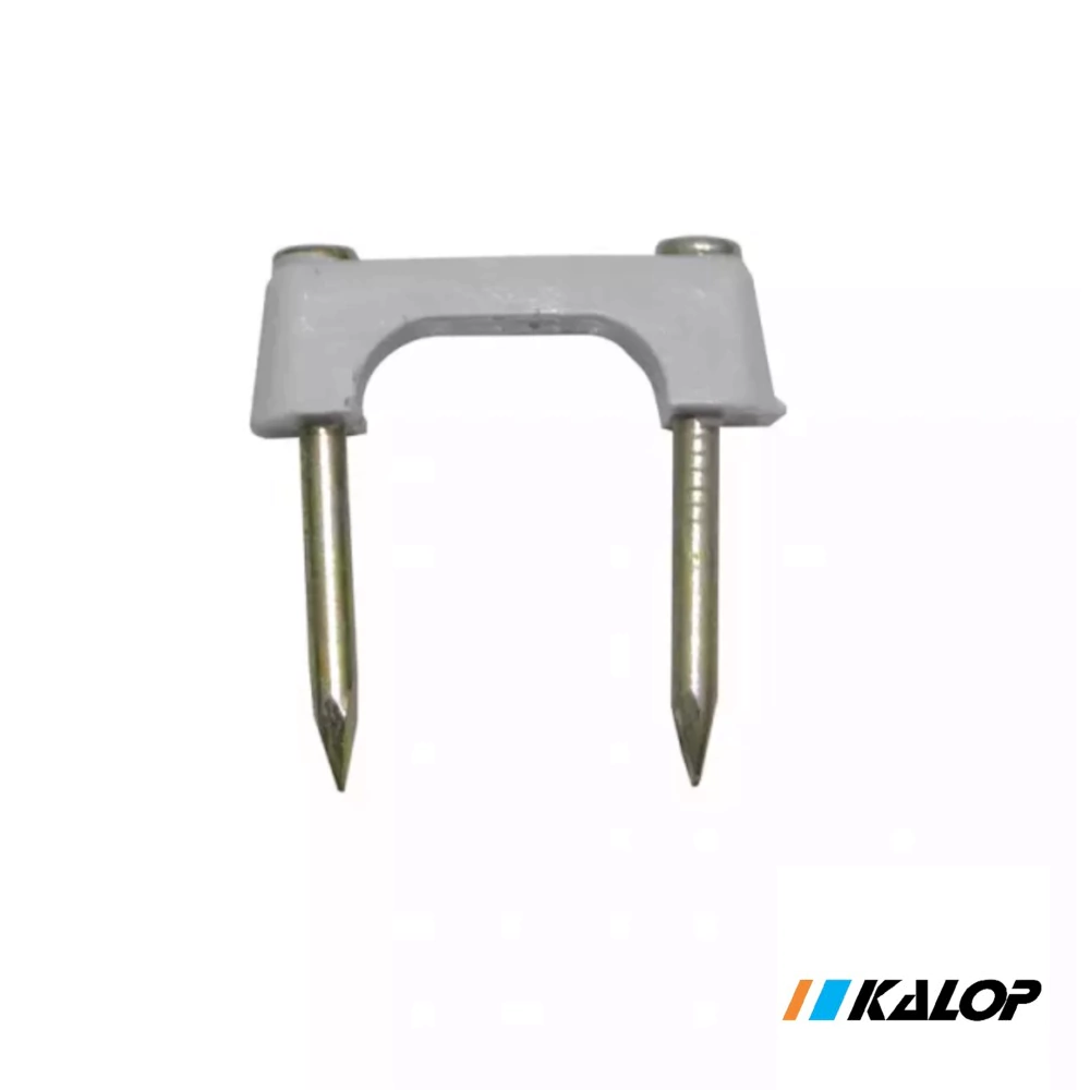 Accesorio de sujeción que permite el montaje sobre superficie de conductores eléctricos aislados, de señal o de datos, en forma permanente o provisoria sobre materiales en donde el clavo de acero pueda ser fijado (paredes de mampostería, tabiques de madera, construcción en seco, etc.).