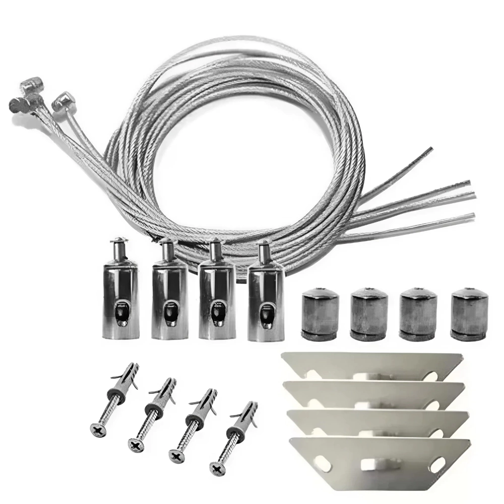 Incluye: 4 cables de acero, 4 tornillos autorroscantes, 4 kits de gancho, 4 terminales de tensado