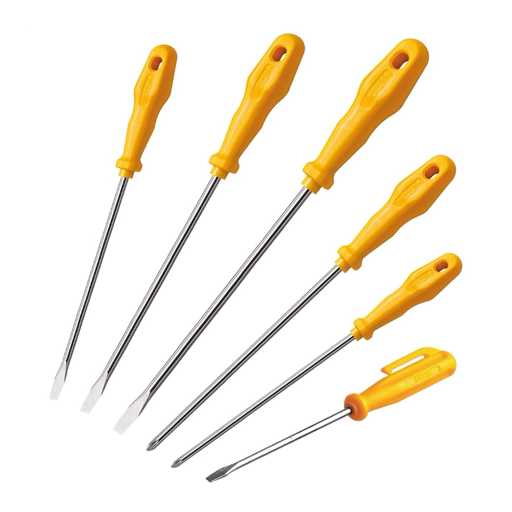 Destornillador punta chata 3/16×4″, Destornillador punta chata 1/4×4″, Destornillador clip 1/8×3″ Destornillador punta cruzada 1/8×3″, Destornillador punta cruzada 3/16×4″, Destornillador punta cruzada 1/4×4″