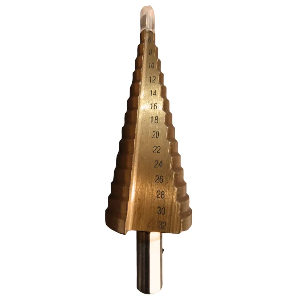 La Mecha Broca Cónica Escalonada 4-32mm es una herramienta versátil y de alta calidad, ideal para trabajos en madera, aluminio, acero y plástico. Fabricada con material HSS y un tratamiento superficial de titanio, garantiza durabilidad y resistencia. Su diámetro de eje es de 10 mm y cuenta con escalones de perforación que van desde 4 mm hasta 32 mm, permitiendo una amplia variedad de aplicaciones sin necesidad de un agujero previo.